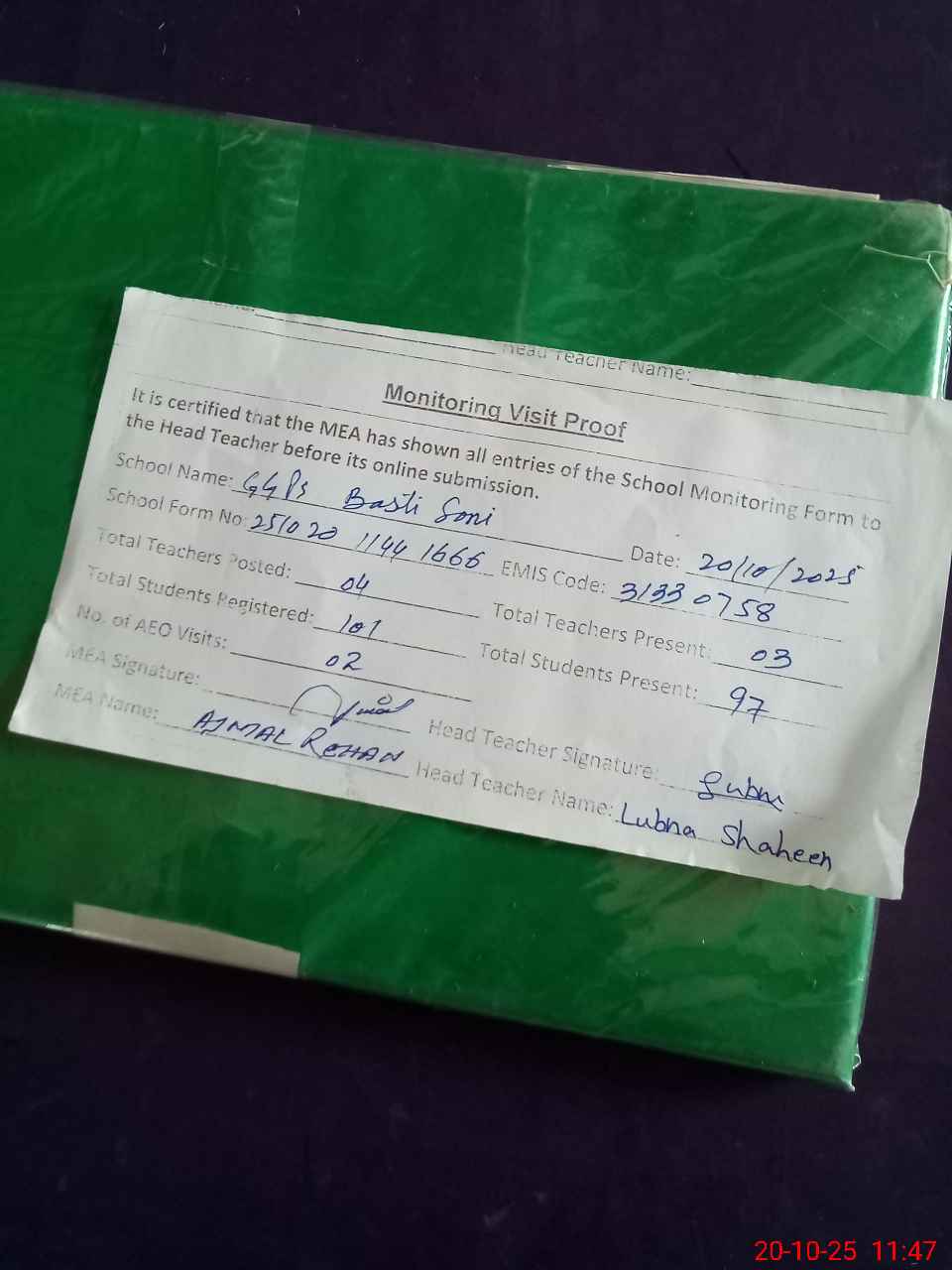 | Attendance Register | Head Teacher | MEA with School | Visit Proof |
