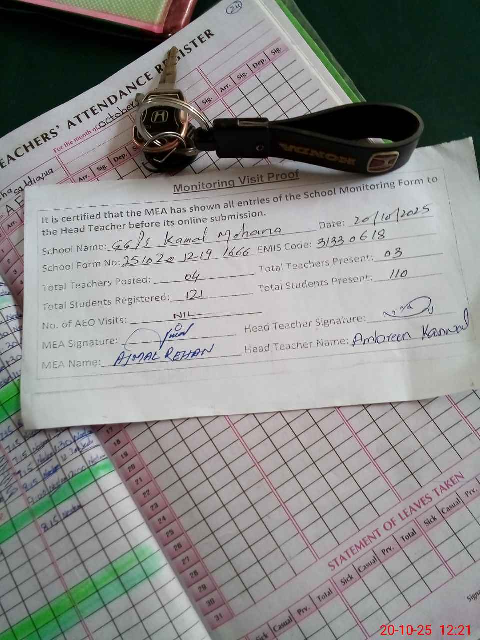 | Attendance Register | Head Teacher | MEA with School | Visit Proof |