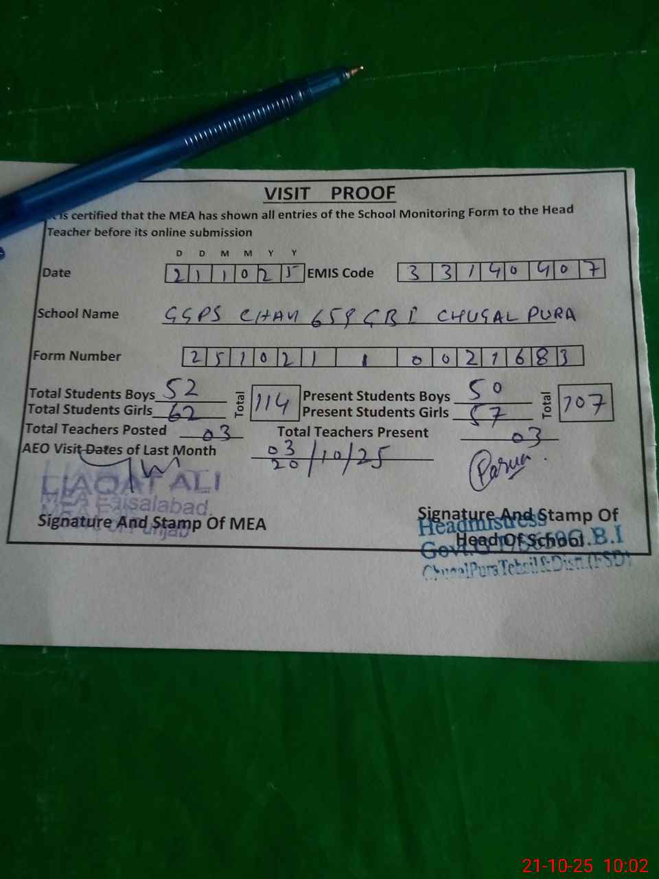 | Certified that this School was Inspected by the Undersigned MEA/DMO Today and the Information Stated Above is as Per Record. | |||||