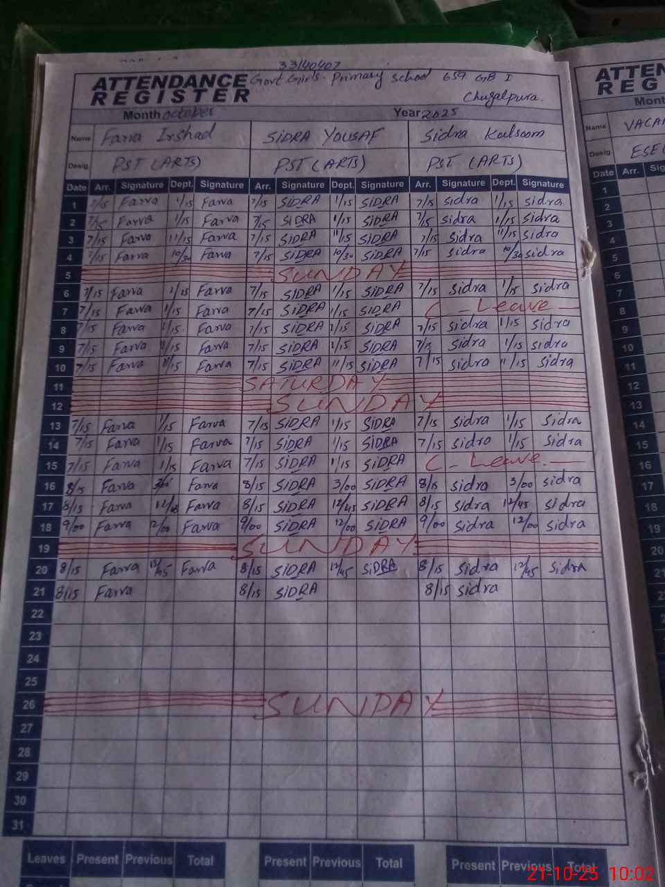 | Leave | Duty | Absent | Maternity | Medical | Ex- Pak |