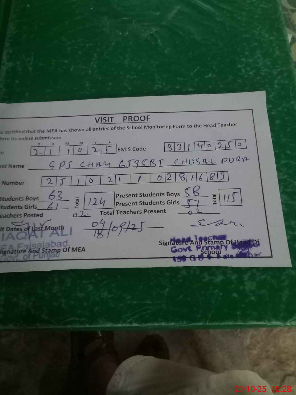| Attendance Register | Head Teacher | MEA with School | Visit Proof |