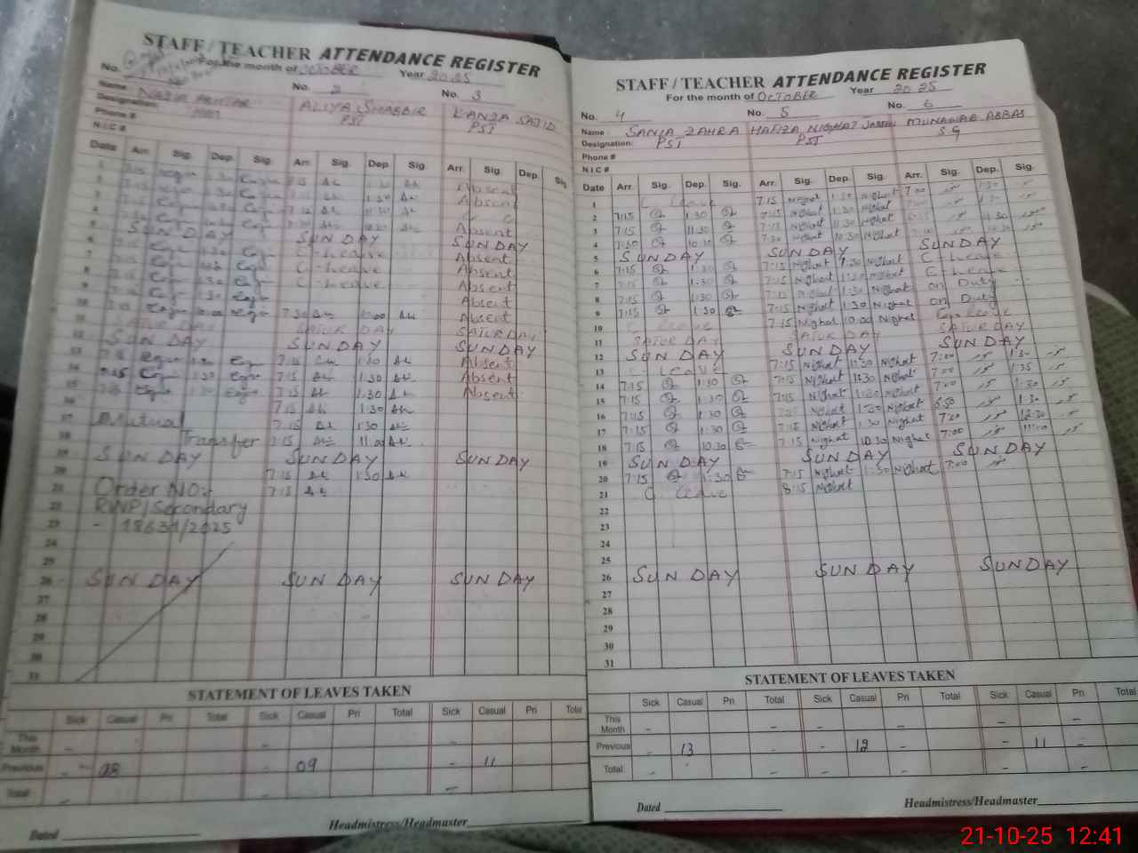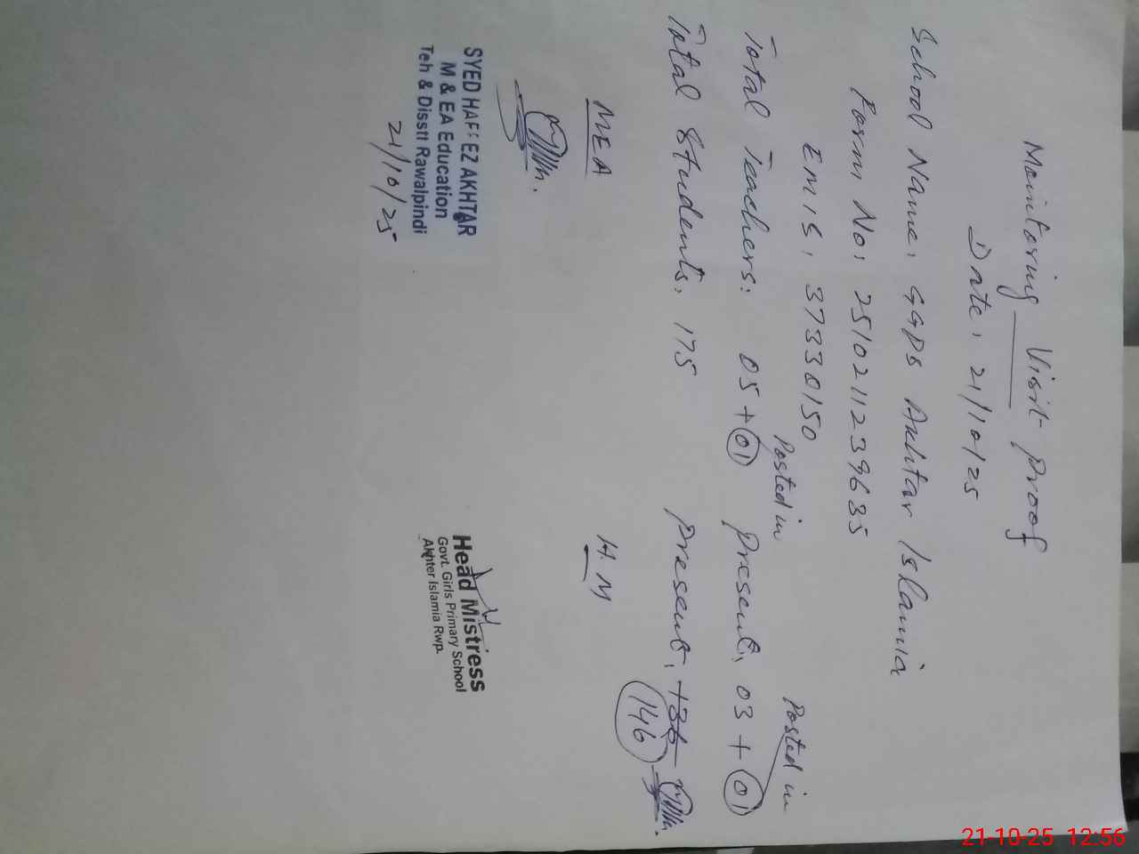 | Remarks (Use Separate Page if Required): Teacher Anila Fazal PST posted in and present in school today Teacher Kanza Sajid is un authorised absent since 2nd September 2025 NSB record not updated in pmiu and sis both apps Students of class Nursery listed in pmiu app are not updated 07 students are in classes 3 and 4 while rest all students have left school | |||||