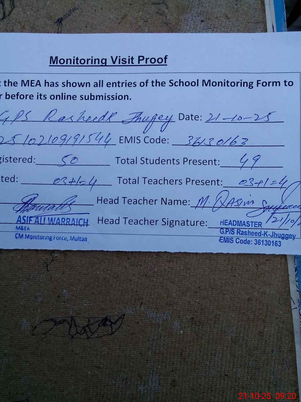| Attendance Register | Head Teacher | MEA with School | Visit Proof |