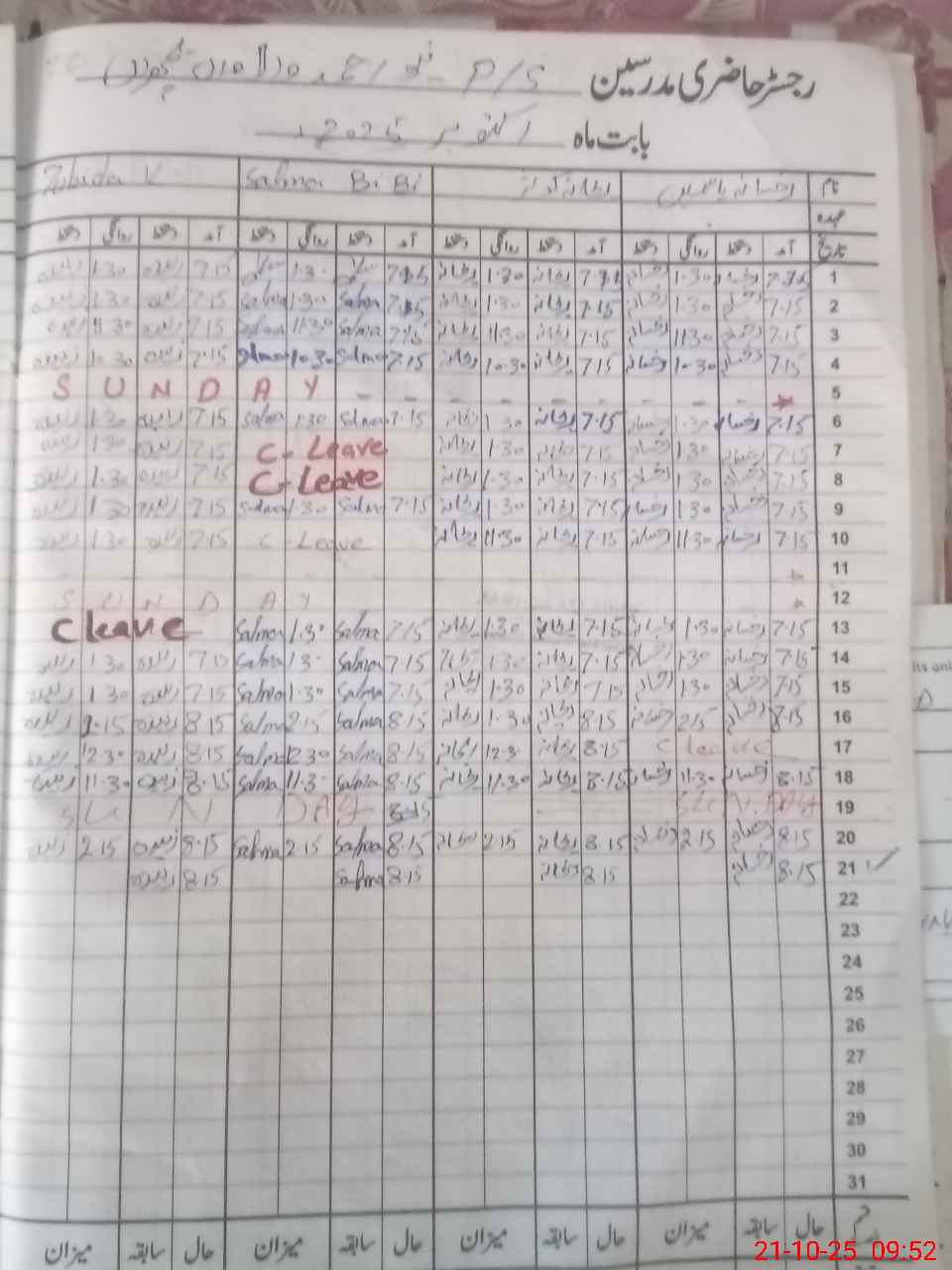 | CNIC | Full Name | Designation | R/C | Absence During Last Calender Month |
