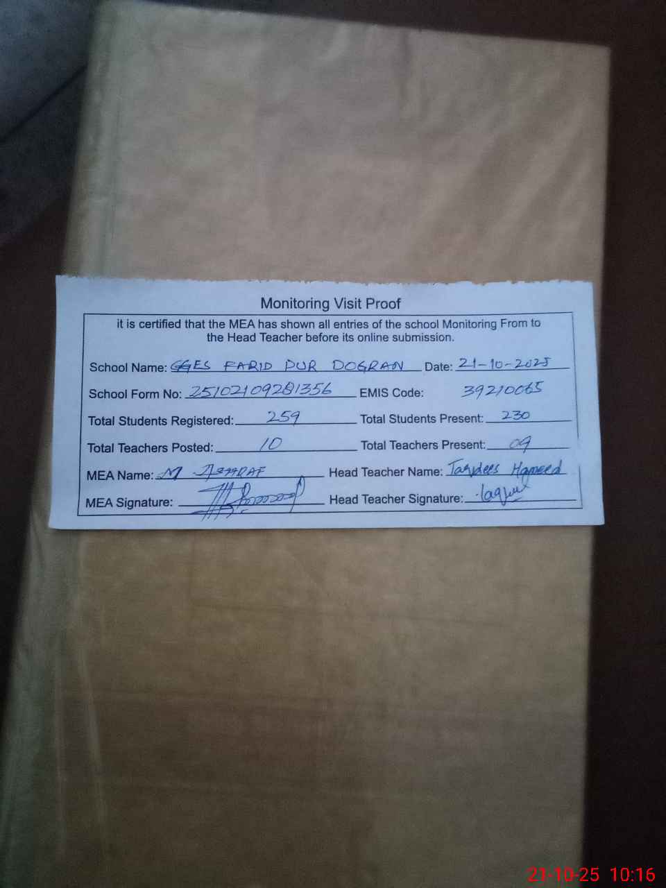 | Certified that this School was Inspected by the Undersigned MEA/DMO Today and the Information Stated Above is as Per Record. | |||||