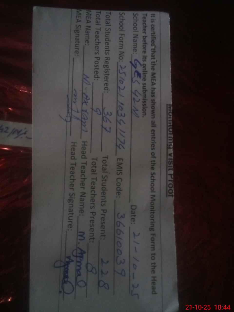 | Certified that this School was Inspected by the Undersigned MEA/DMO Today and the Information Stated Above is as Per Record. | |||||