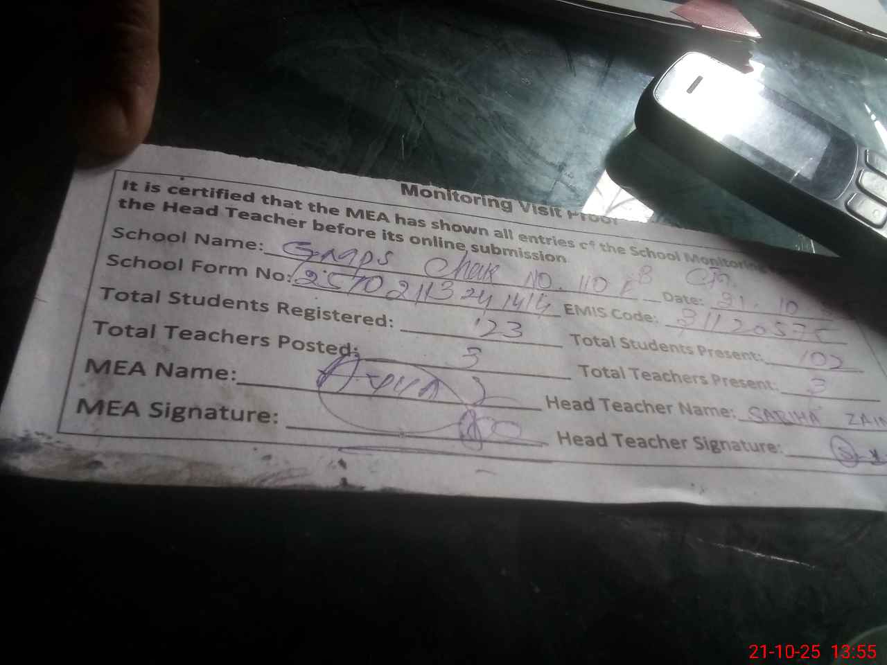 | Attendance Register | Head Teacher | MEA with School | Visit Proof |