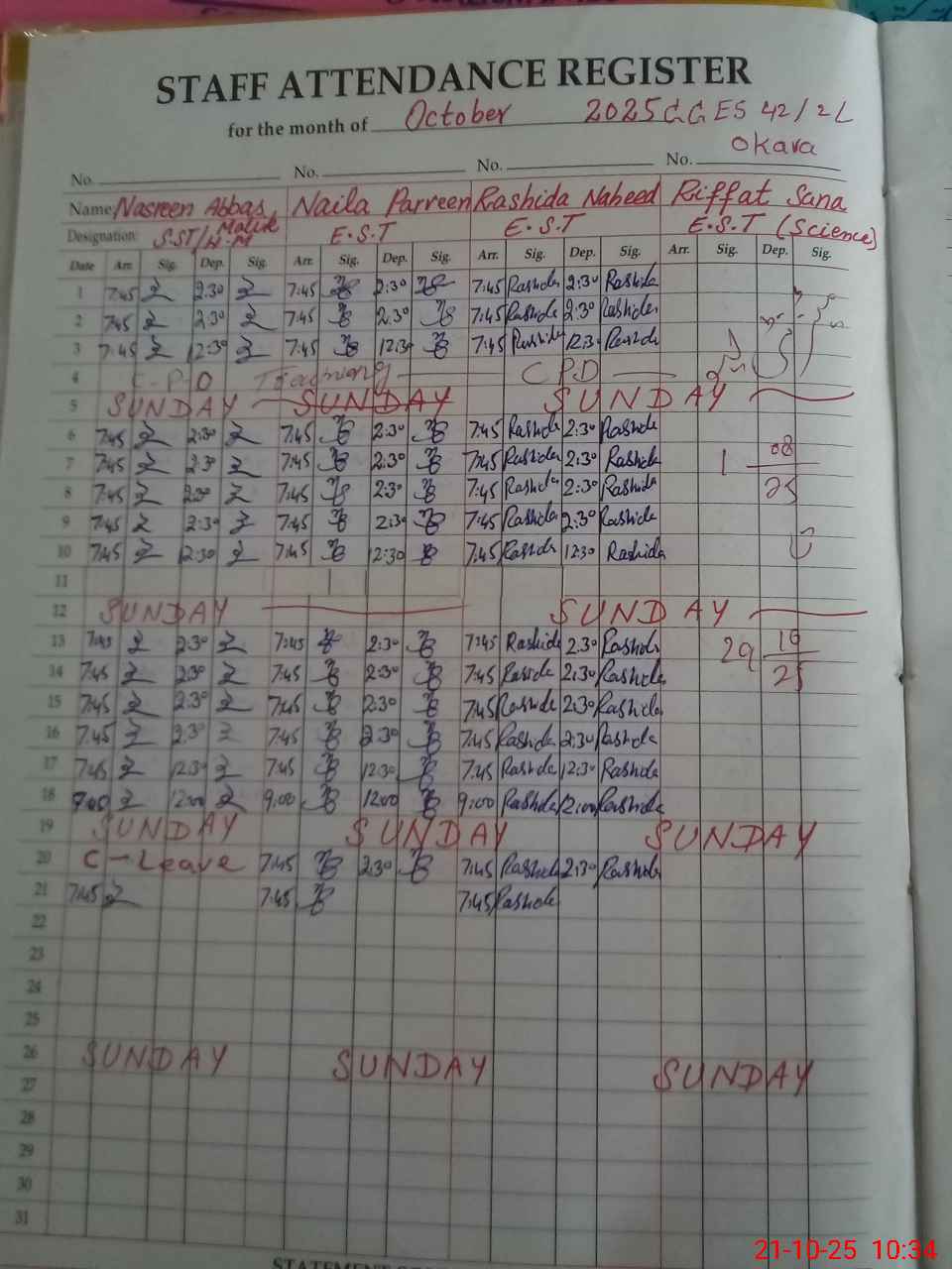 | CNIC | Full Name | Designation | R/C | Absence During Last Calender Month |