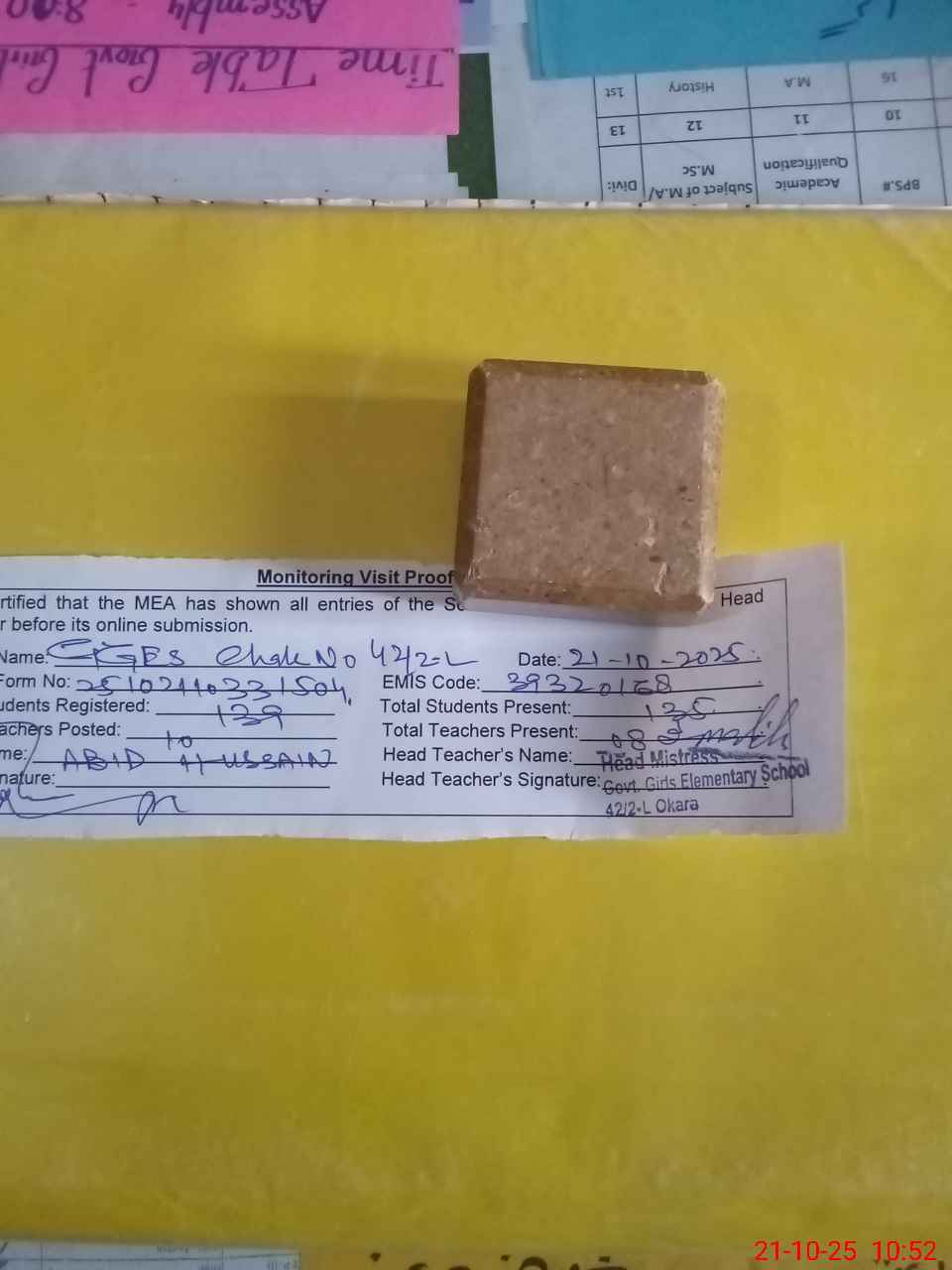 | Certified that this School was Inspected by the Undersigned MEA/DMO Today and the Information Stated Above is as Per Record. | |||||