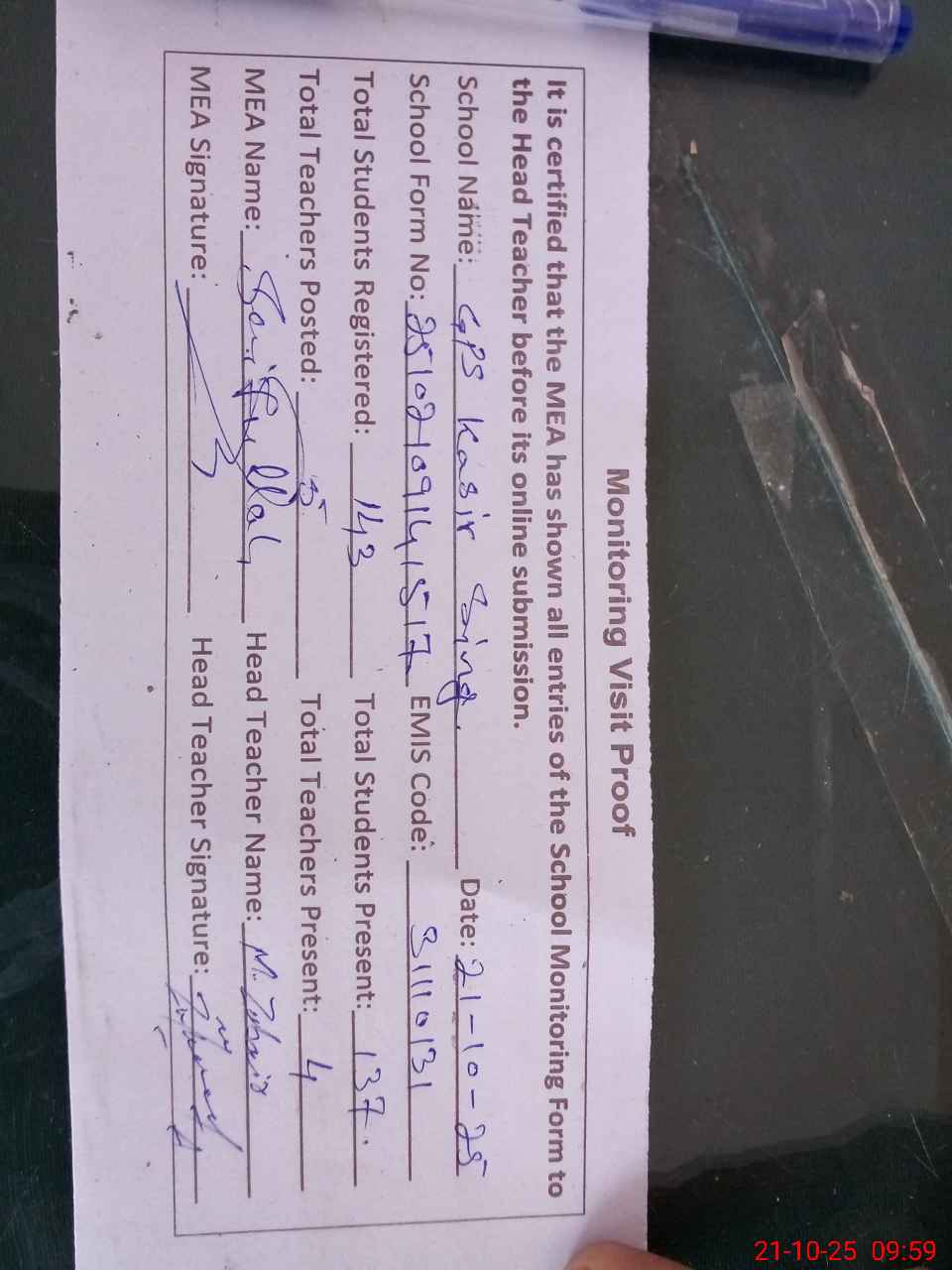 | Attendance Register | Head Teacher | MEA with School | Visit Proof |