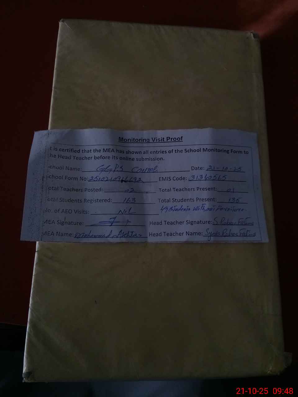 | Attendance Register | Head Teacher | MEA with School | Visit Proof |