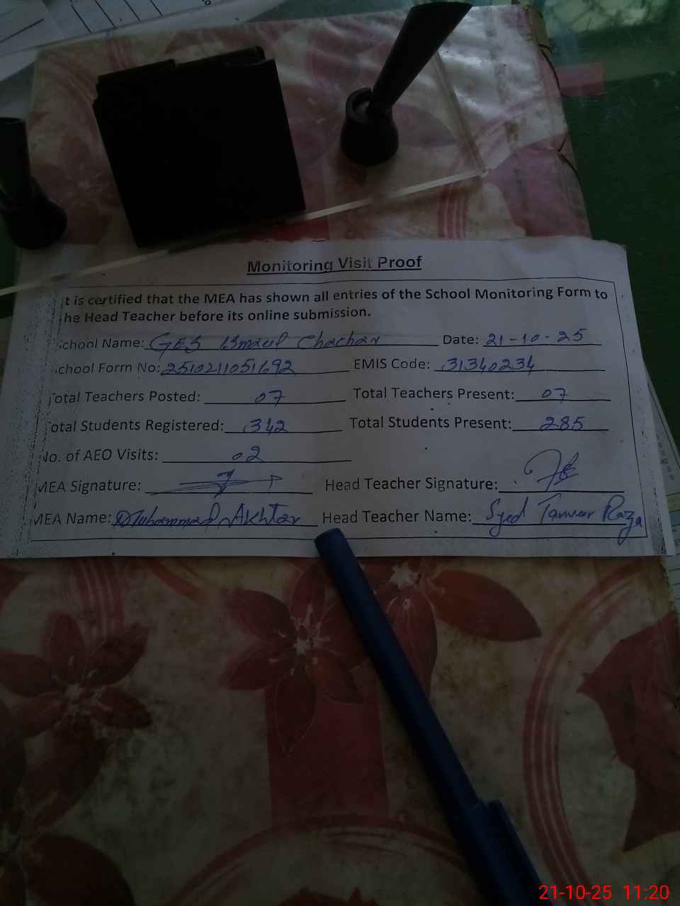 | Attendance Register | Head Teacher | MEA with School | Visit Proof |