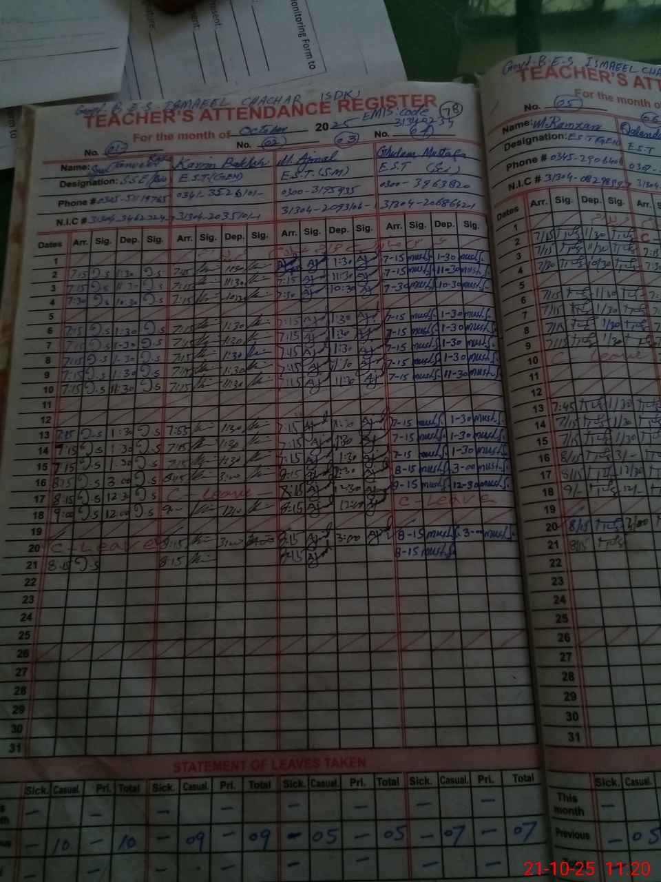 | CNIC | Full Name | Designation | R/C | Absence during last cal. month |