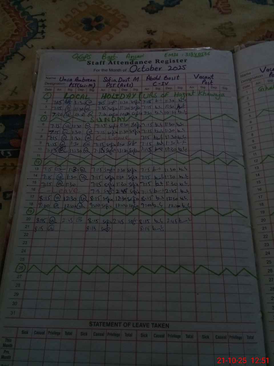 | Leave | Duty | Absent | Maternity | Medical | Ex- Pak |
