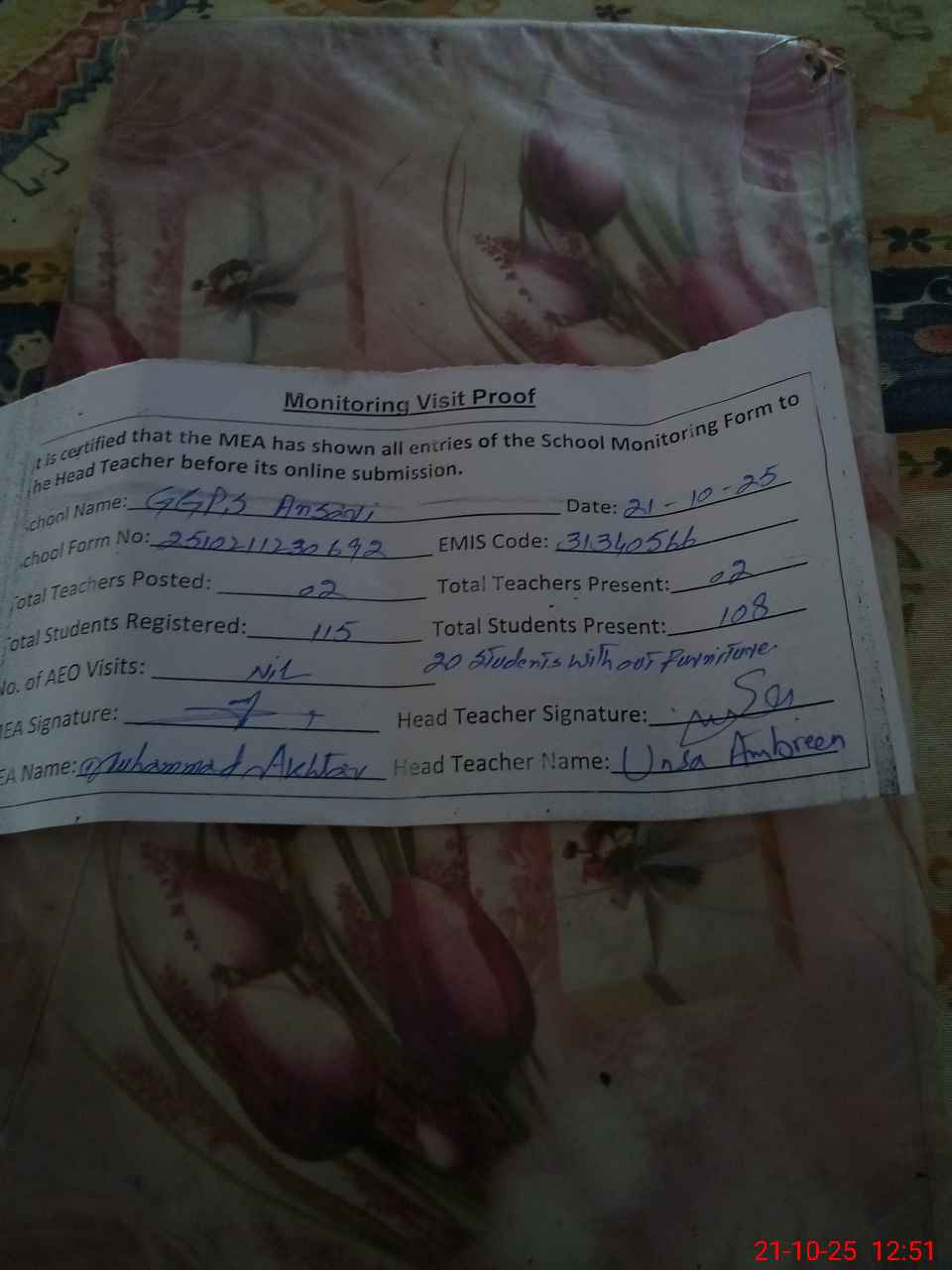 | Attendance Register | Head Teacher | MEA with School | Visit Proof |