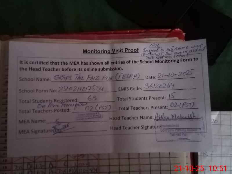 | EMIS Code: 36120284 | Name of School: GGPS TAILL FAIZ PUR SHUJABAD | |||