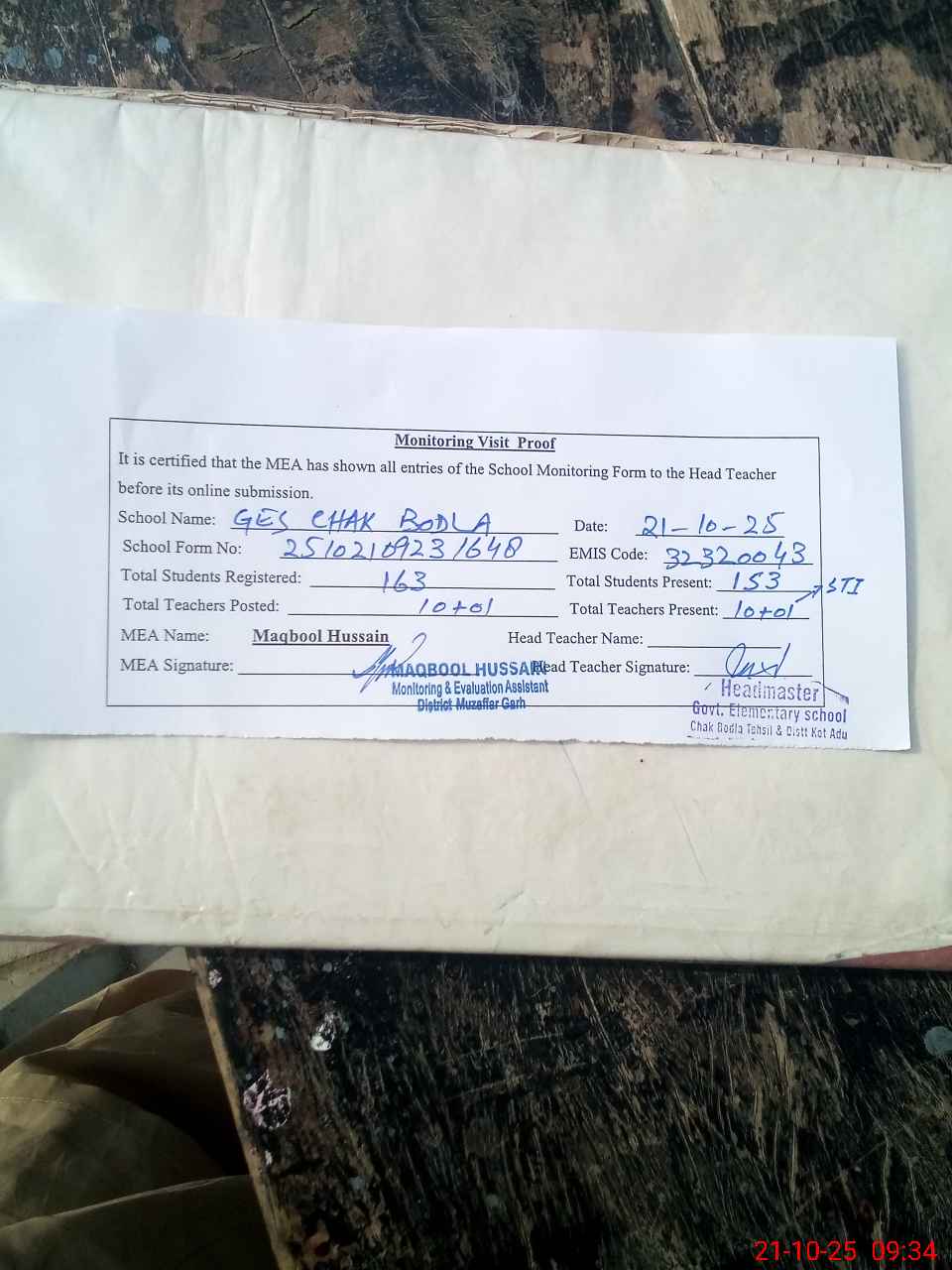 | EMIS Code: 32320043 | Name of School: GES CHAK BODLA | |||