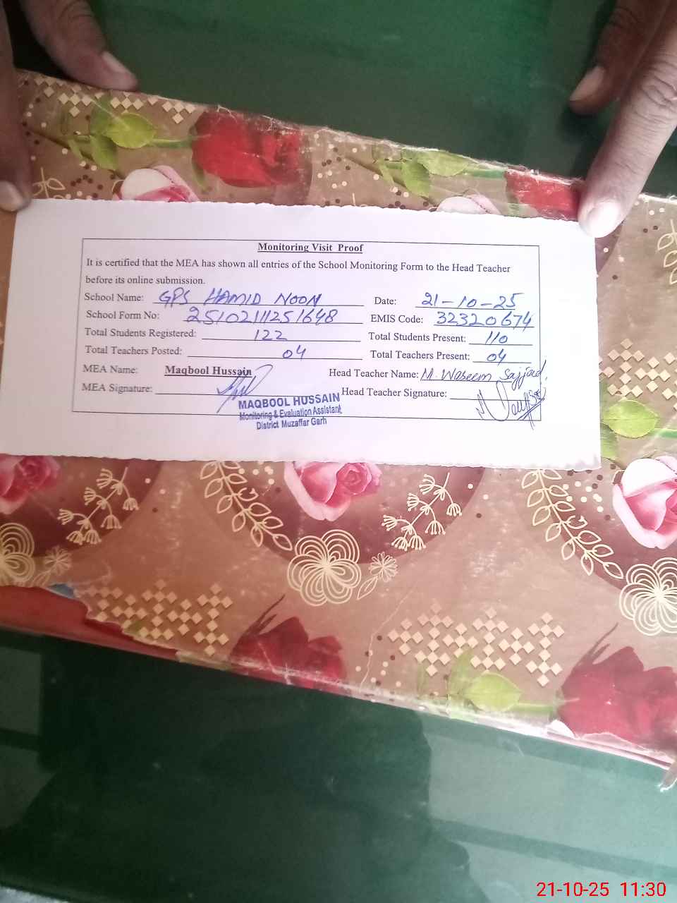 | EMIS Code: 32320674 | Name of School: GPS HAMID NOON WALA | |||
