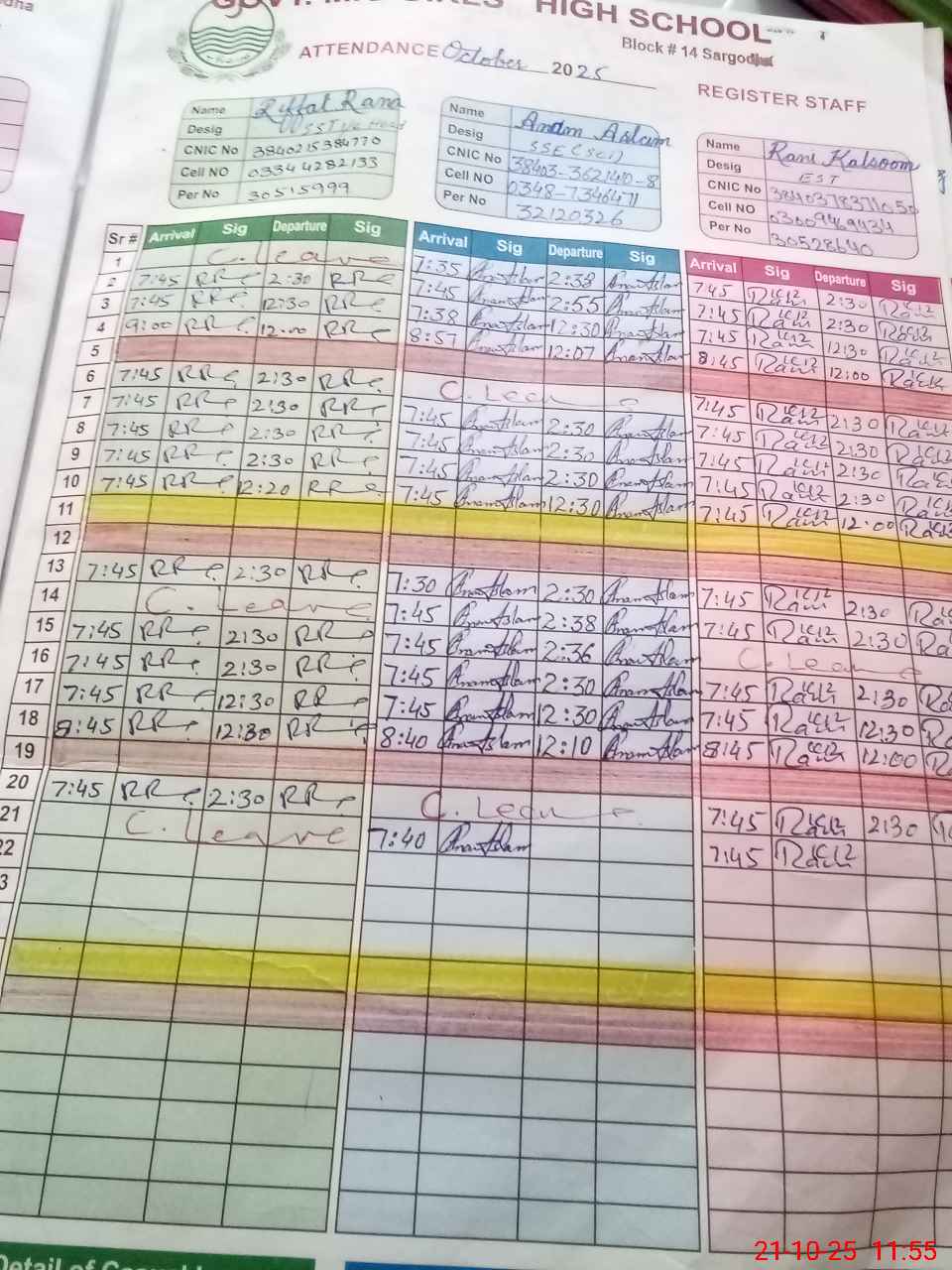 | CNIC | Full Name | Designation | R/C | Absence during last cal. month |