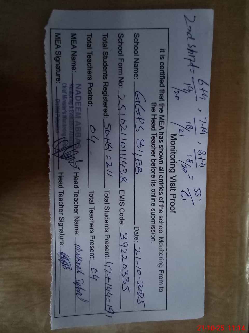 | Attendance Register | Head Teacher | MEA with School | Visit Proof |