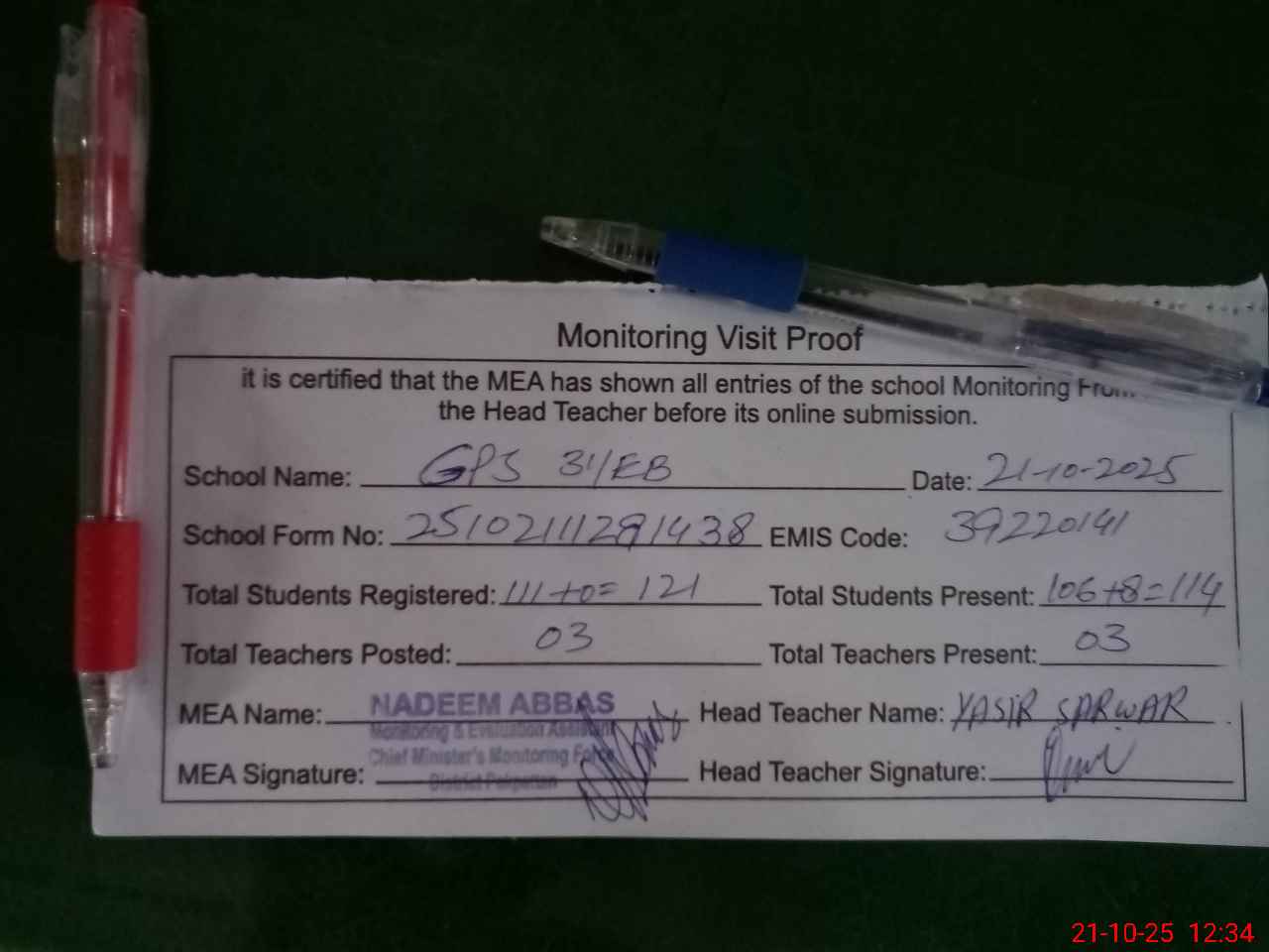 | EMIS Code: 39220141 | Name of School: GPS CHAK NO. 31 EB | |||