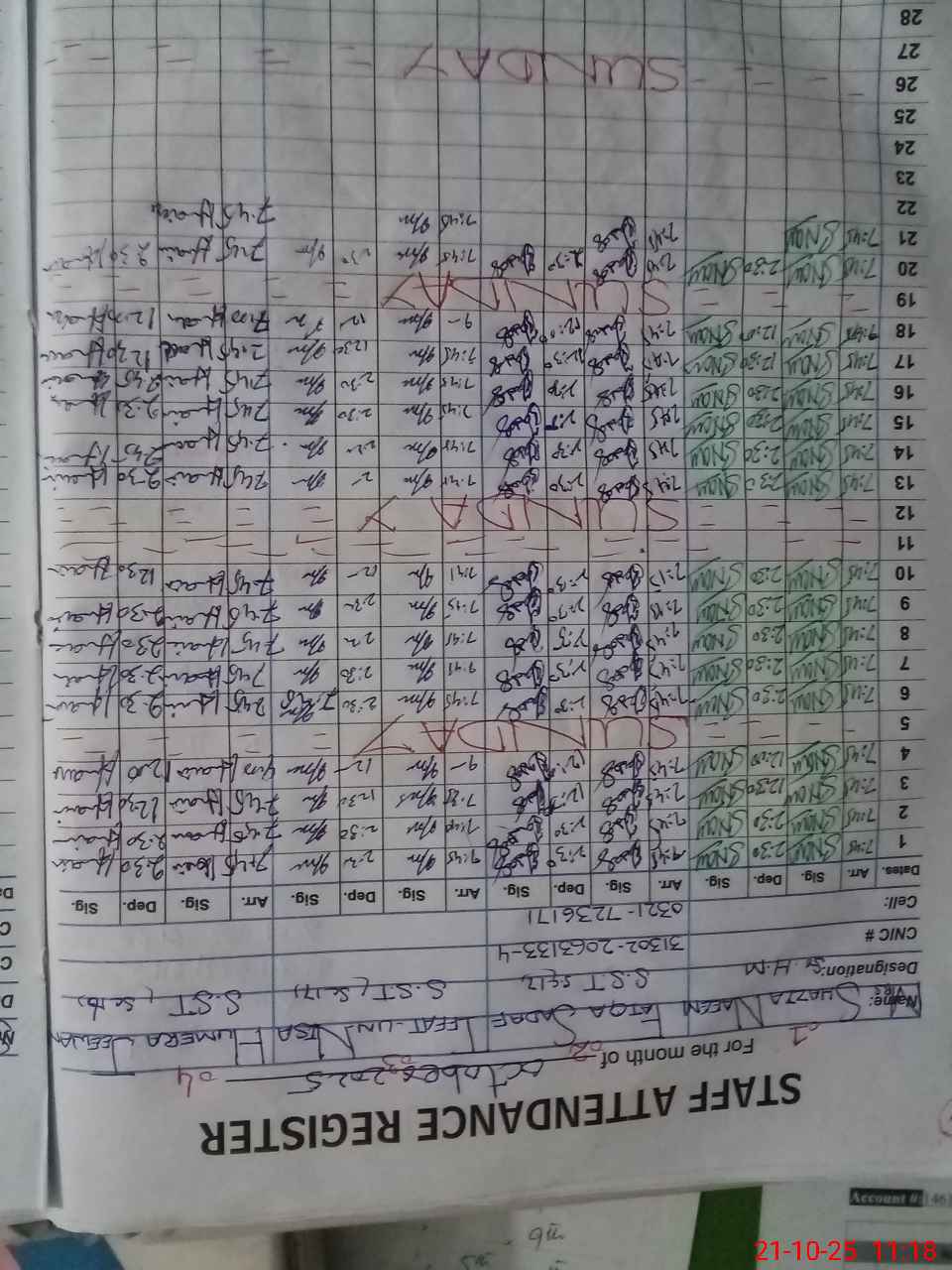 | CNIC | Full Name | Designation | R/C | Absence During Last Calender Month |