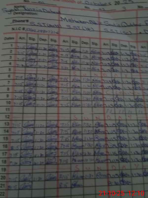 | CNIC | Full Name | Designation | R/C | Absence During Last Calender Month |