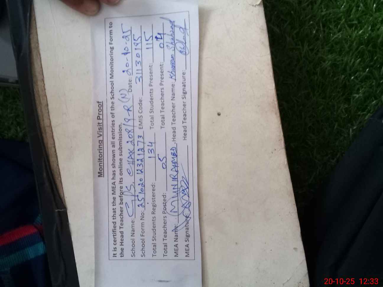 | Attendance Register | Head Teacher | MEA with School | Visit Proof |