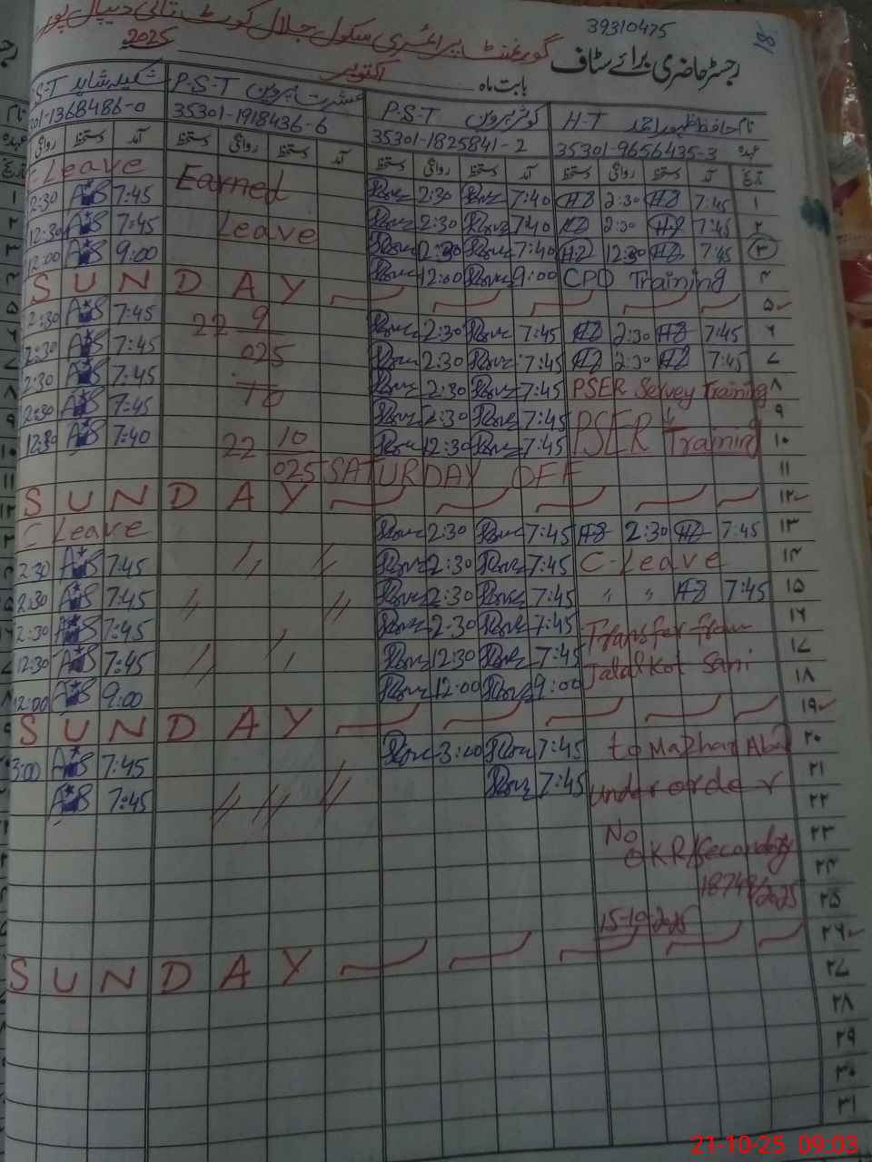 | CNIC | Full Name | Designation | R/C | Absence During Last Calender Month |