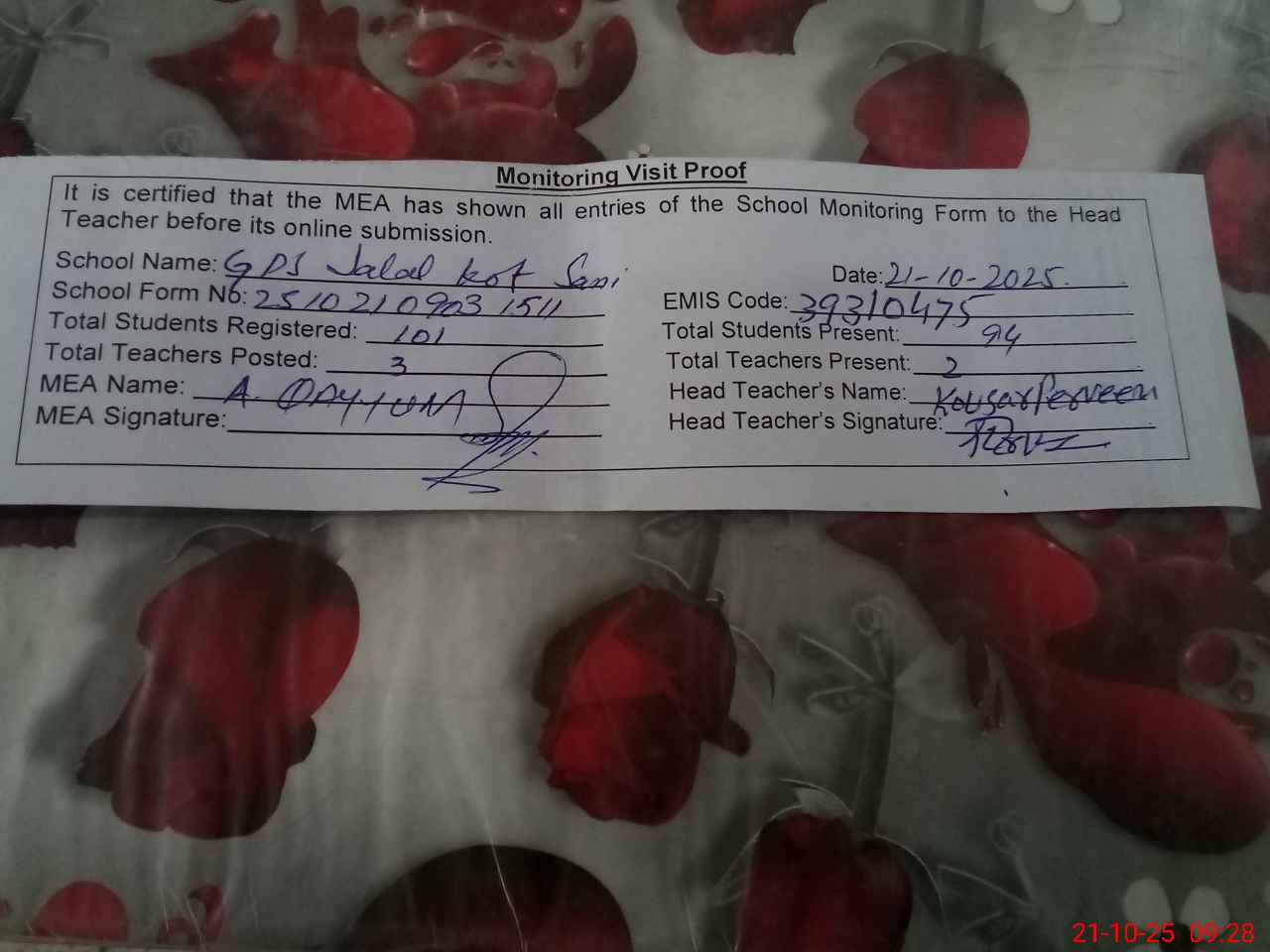 | Attendance Register | Head Teacher | MEA with School | Visit Proof |
