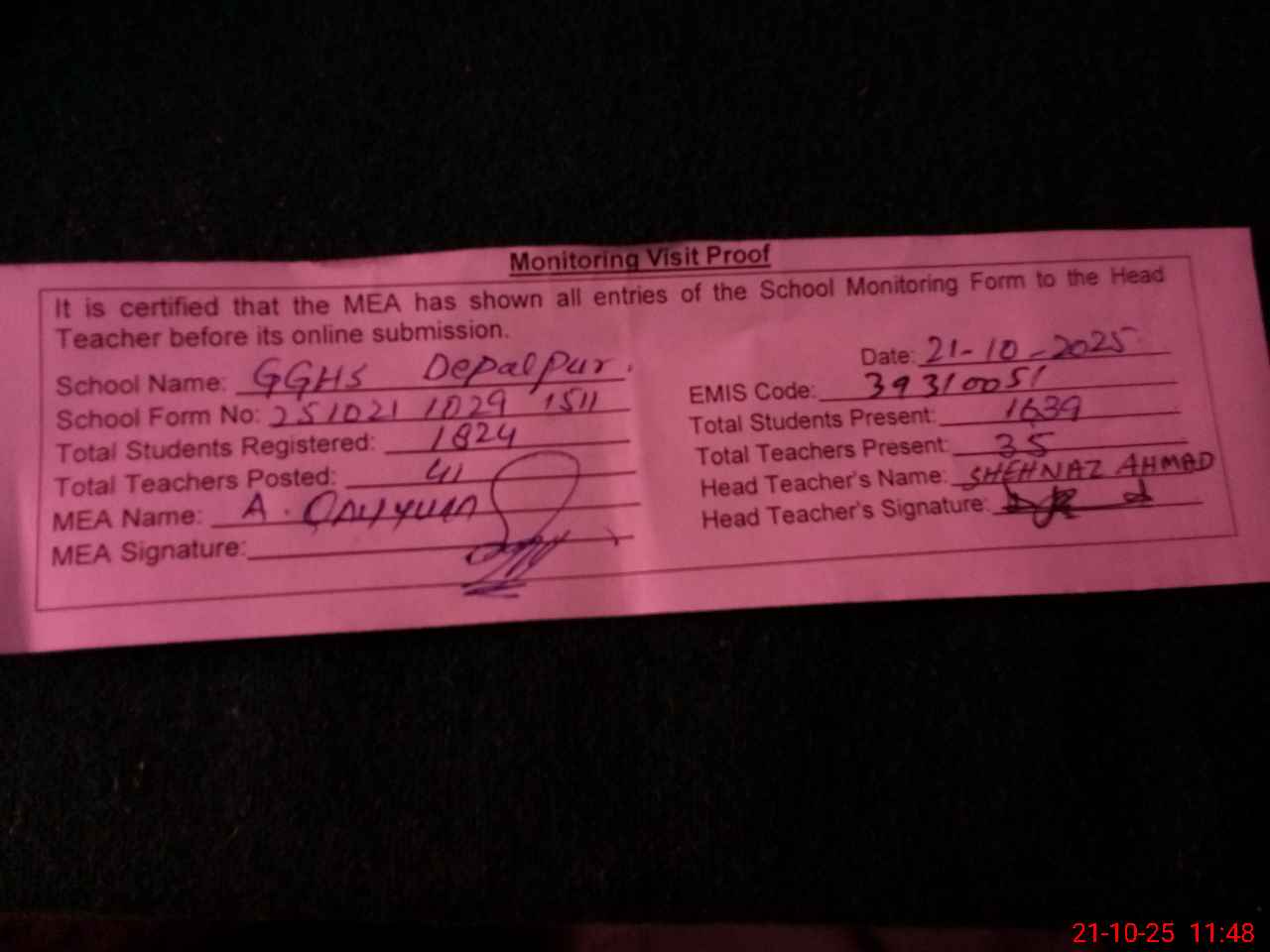 | EMIS Code: 39310051 | Name of School: GGHS DEPALPUR | |||