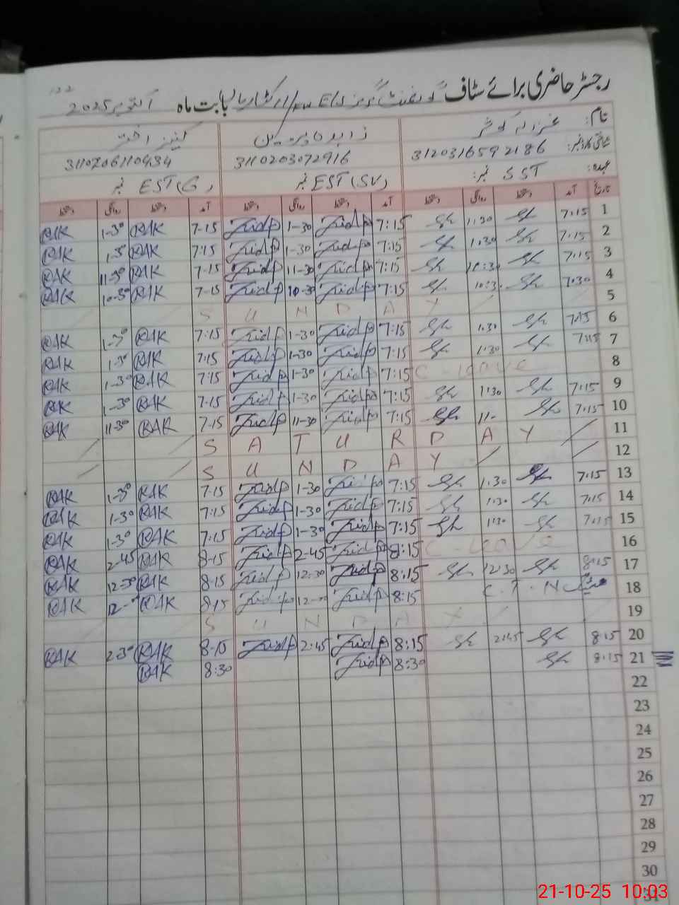 | CNIC | Full Name | Designation | R/C | Absence during last cal. month |