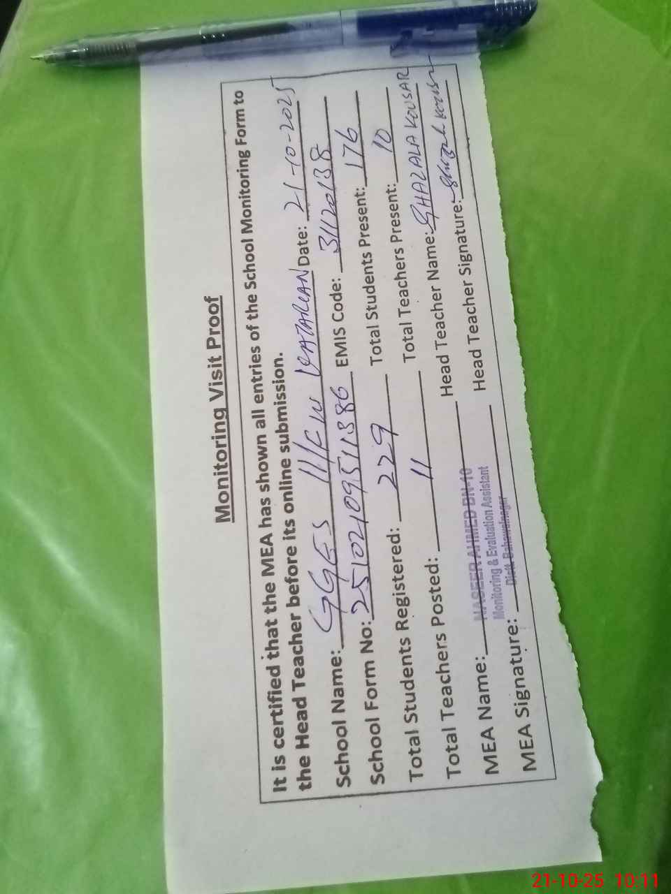 | Attendance Register | Head Teacher | MEA with School | Visit Proof |