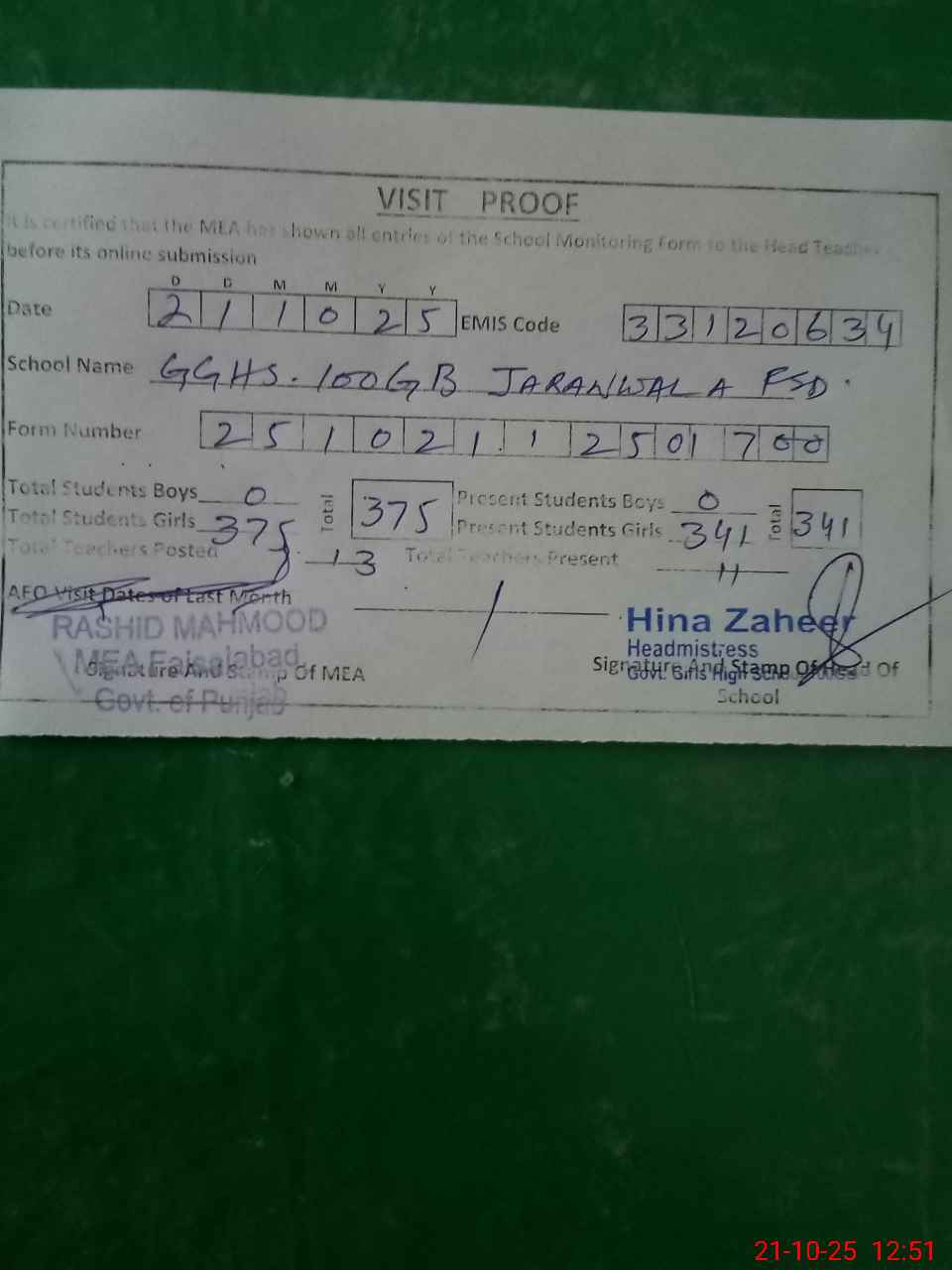 | Certified that this School was Inspected by the Undersigned MEA/DMO Today and the Information Stated Above is as Per Record. | |||||
