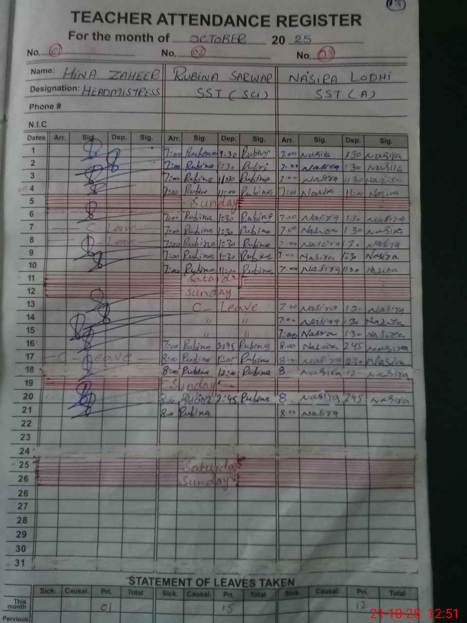 | CNIC | Full Name | Designation | R/C | Absence During Last Calender Month |