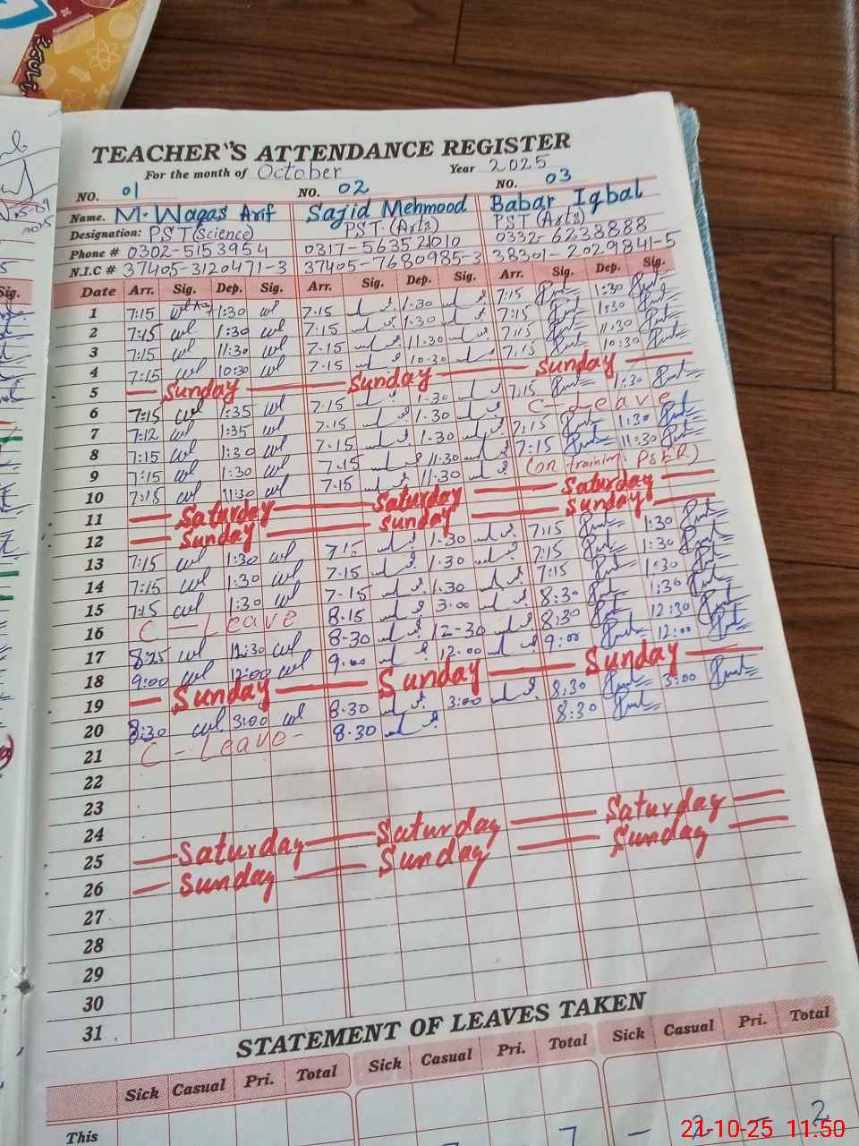 | CNIC | Full Name | Designation | R/C | Absence during last cal. month |
