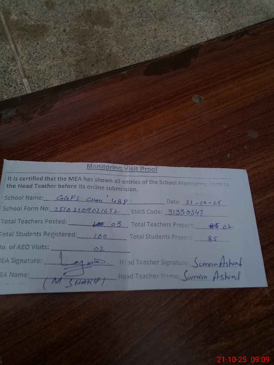 | Attendance Register | Head Teacher | MEA with School | Visit Proof |