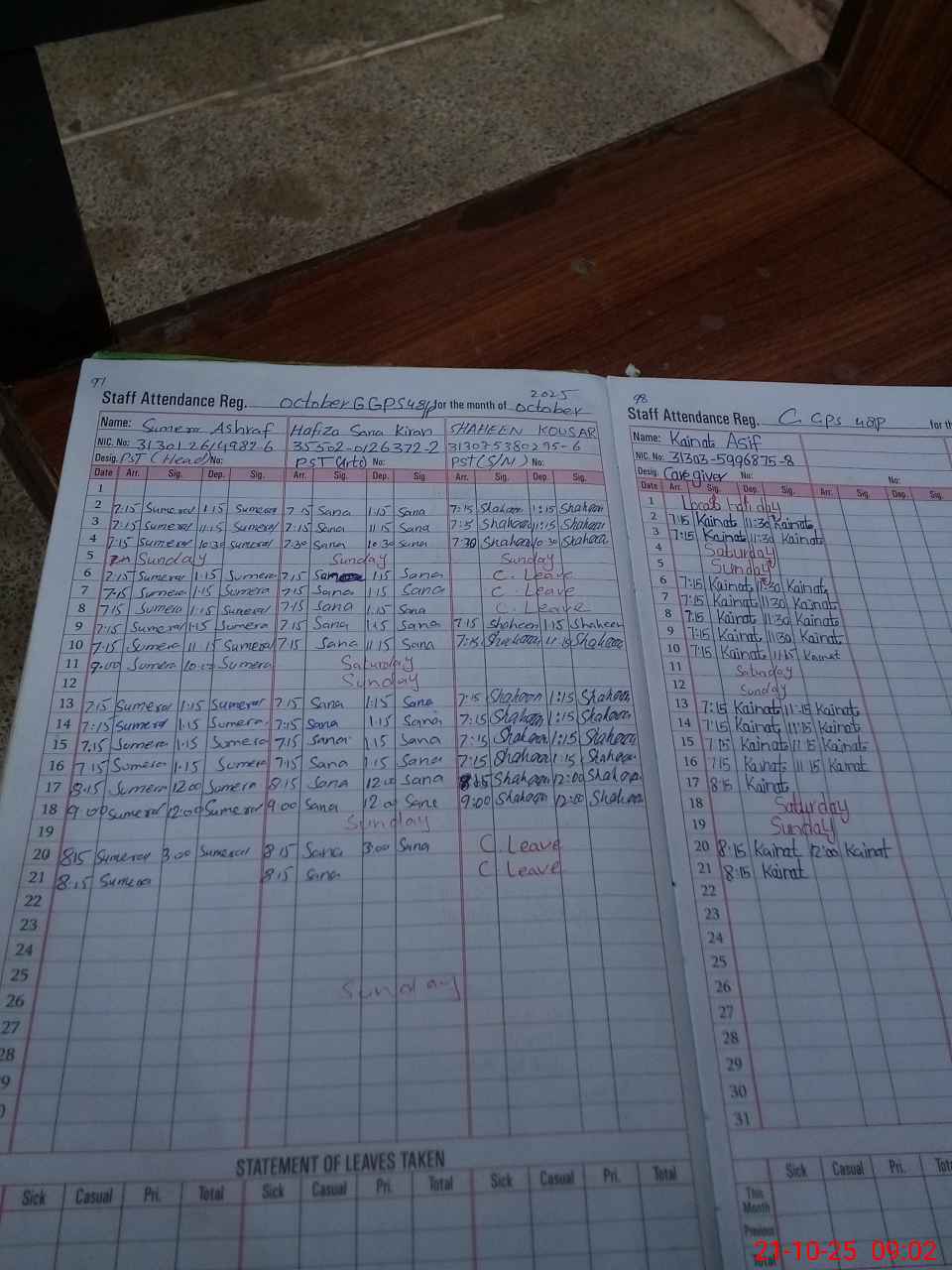 | CNIC | Full Name | Designation | R/C | Absence During Last Calender Month |