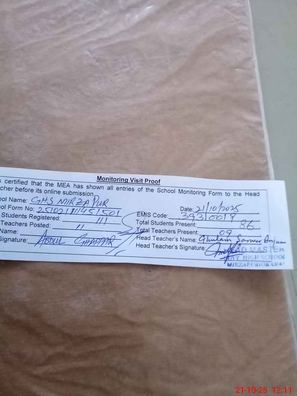 | EMIS Code: 39310019 | Name of School: GHS MIRZA PUR | |||