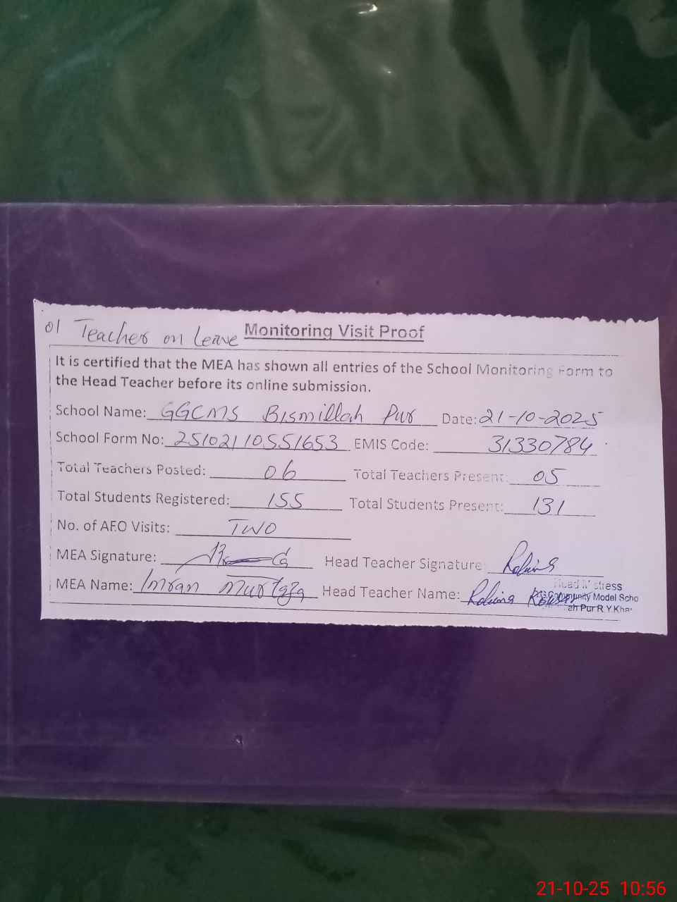 | EMIS Code: 31330784 | Name of School: GGCMS BISMILLAH PUR | |||