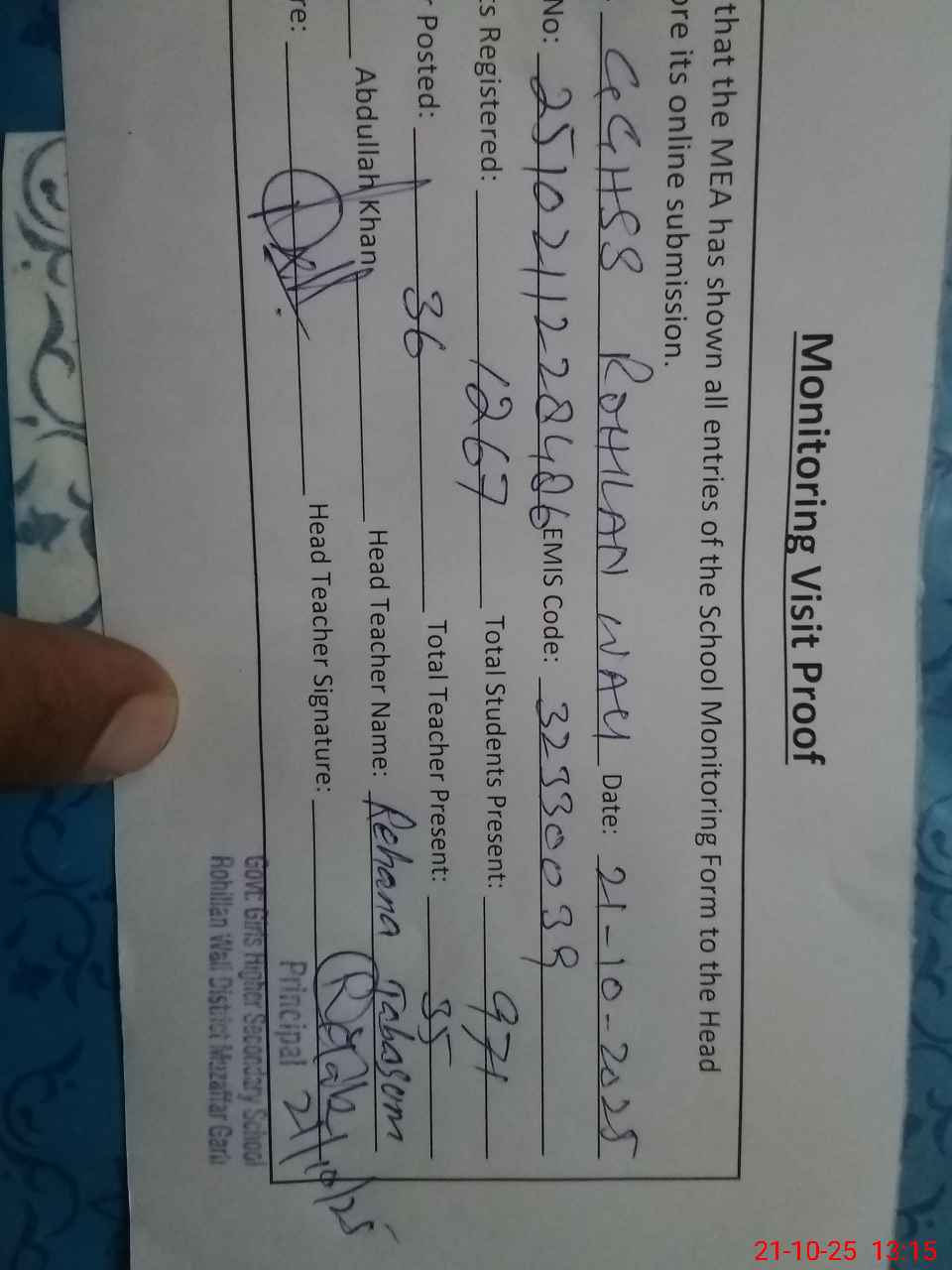 | EMIS Code: 32330039 | Name of School: GGHSS ROHILLAN WALI | |||
