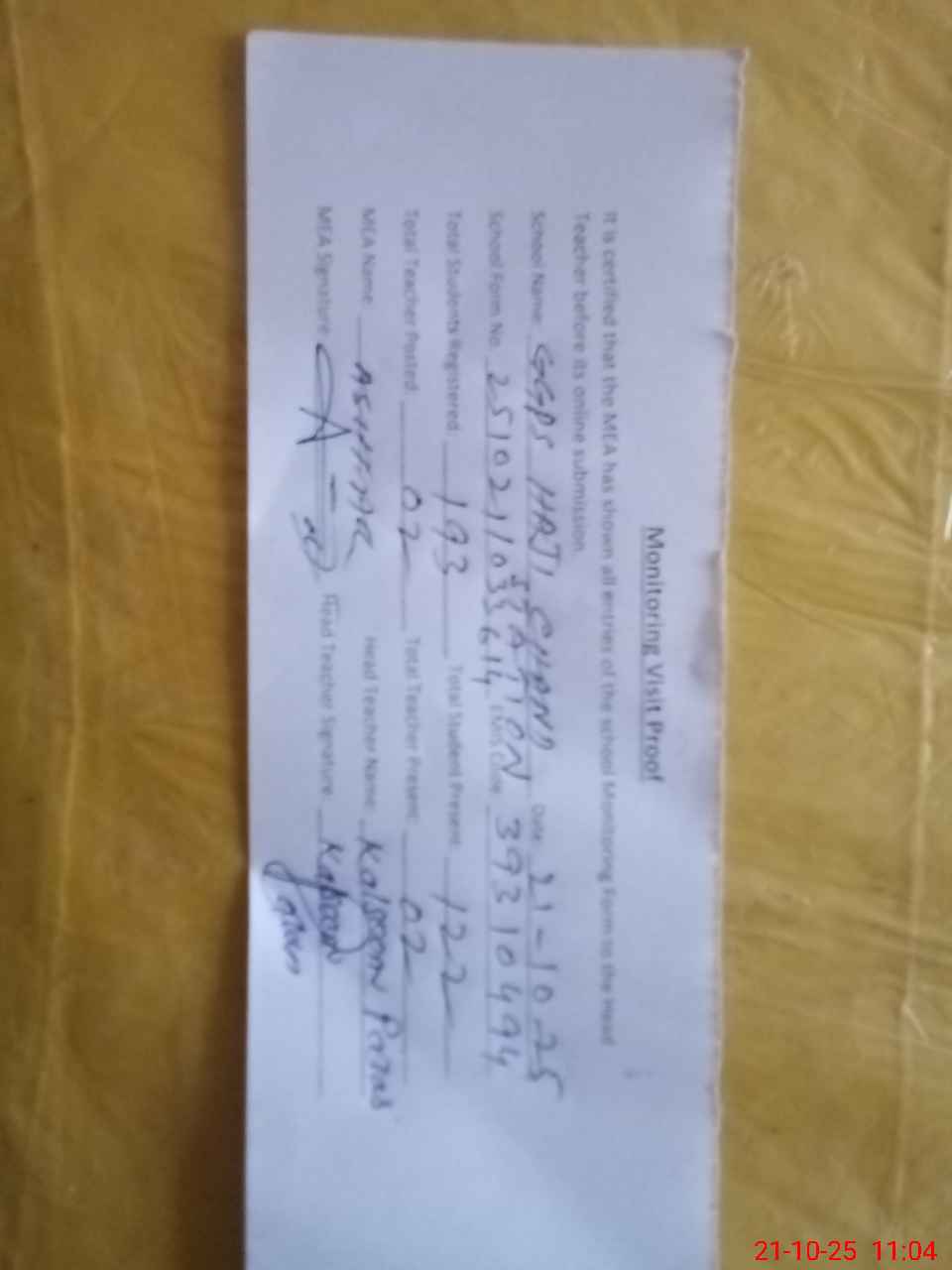 | Attendance Register | Head Teacher | MEA with School | Visit Proof |