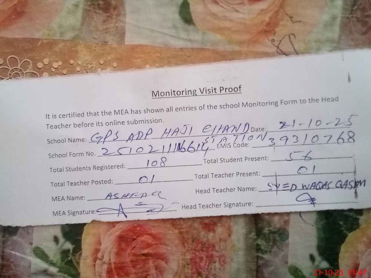 | Attendance Register | Head Teacher | MEA with School | Visit Proof |