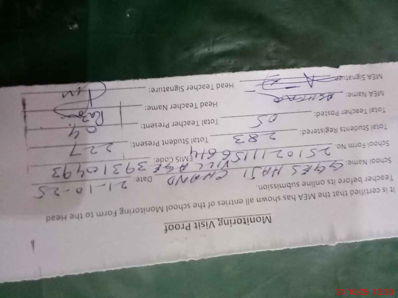 | Attendance Register | Head Teacher | MEA with School | Visit Proof |