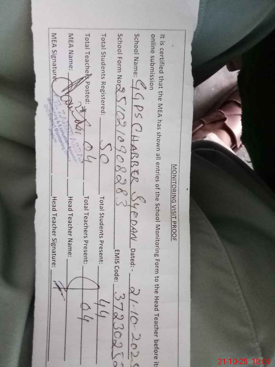 | Monitoring Date: 21-10-2025 | Start Time: 21-10-2025 09:08 AM | End Time: 21-10-2025 10:13 AM | Name of MEA: Za**** Ab**** | |