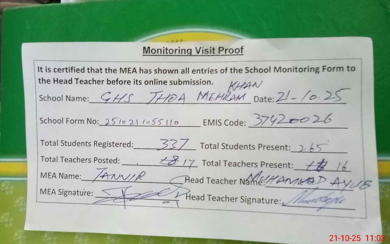 | EMIS Code: 37420026 | Name of School: GHS THOA MEHRAM KHAN | |||