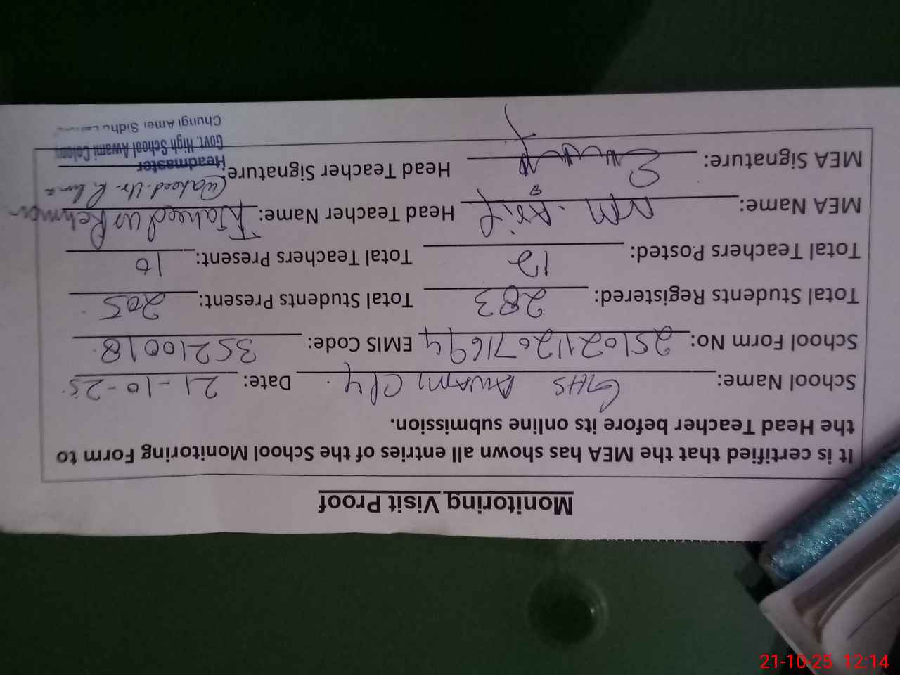 | Certified that this School was Inspected by the Undersigned MEA/DMO Today and the Information Stated Above is as Per Record. | |||||