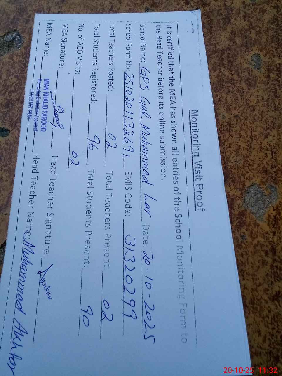 | Attendance Register | Head Teacher | MEA with School | Visit Proof |