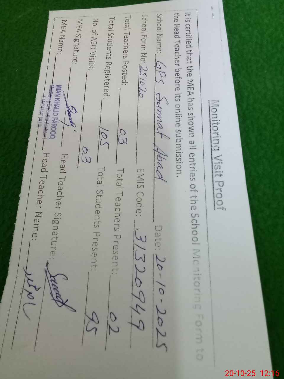 | Attendance Register | Head Teacher | MEA with School | Visit Proof |