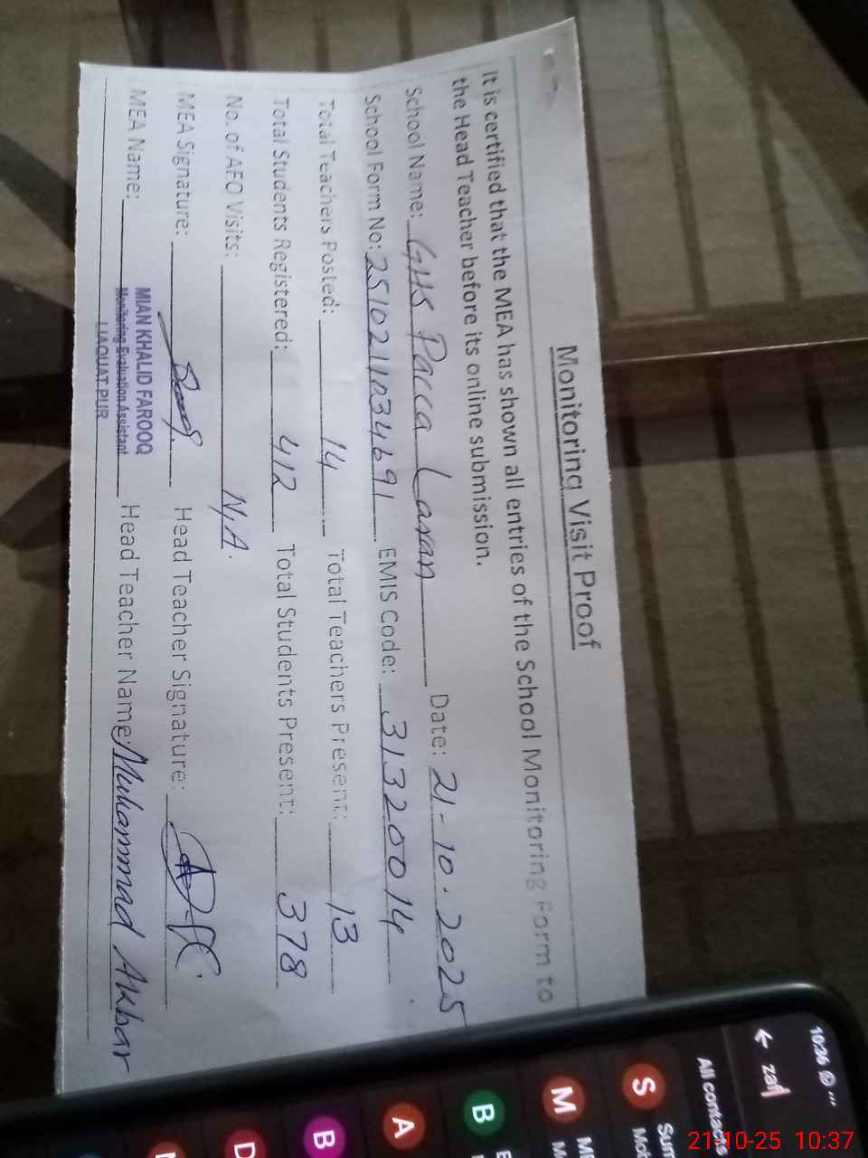 | Monitoring Date: 21-10-2025 | Start Time: 21-10-2025 09:56 AM | End Time: 21-10-2025 10:37 AM | Name of MEA: Kh**** Fa**** | |
